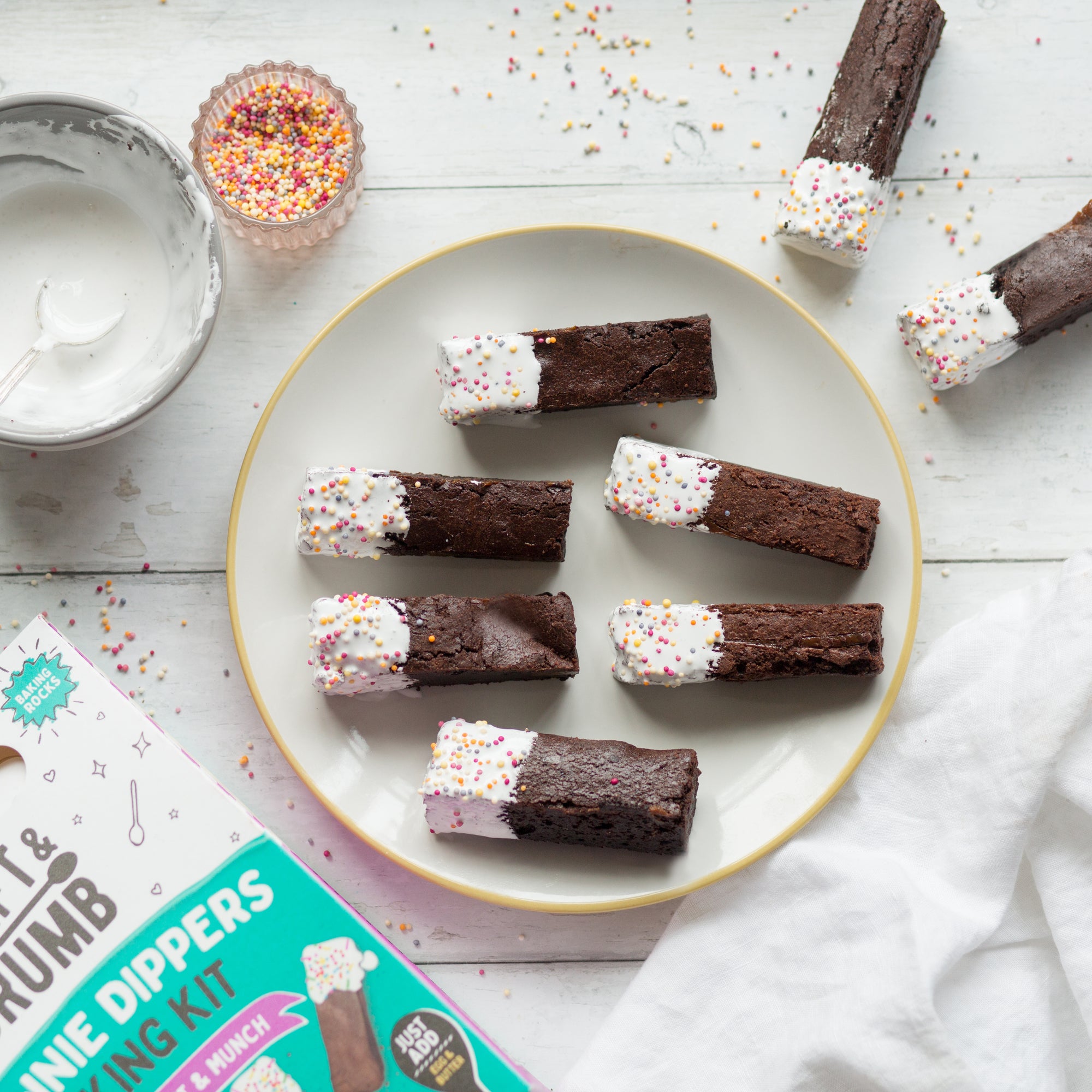 Dive into the deliciousness with our Brownie Dipper Kit. This kit comes with all the dry ingredients to bake a batch of fresh, gooey brownies that are ready to be dipped icing sugar, decorated with sprinkles and then devoured. Whilst the oven's on, you can easily repurpose the box using only scissors and a little glue to make a nifty dippers tray for your brownies. Your tastebuds won't know what hit them. Yum!!