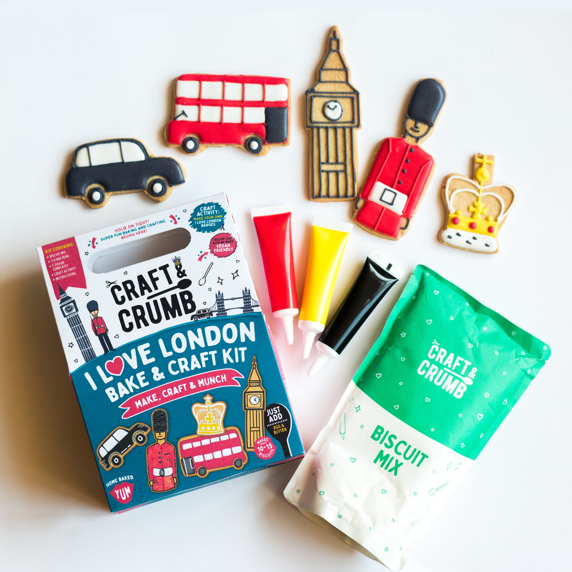 The big smoke in biscuit form! This London inspired baking kit contains everything you need to bake, decorate and enjoy all your favourite landmarks. Each box also contains a craft activity to make London themed badges to wear 🇬🇧💂