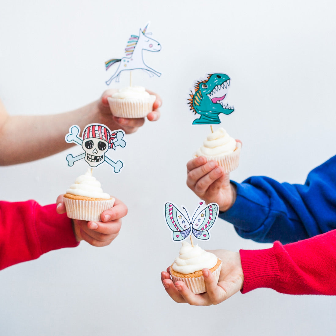 Pop-out card toppers ready to colour in. Attach to the supplied pick and pop on top of your cupcake before tucking in and enjoying.