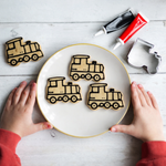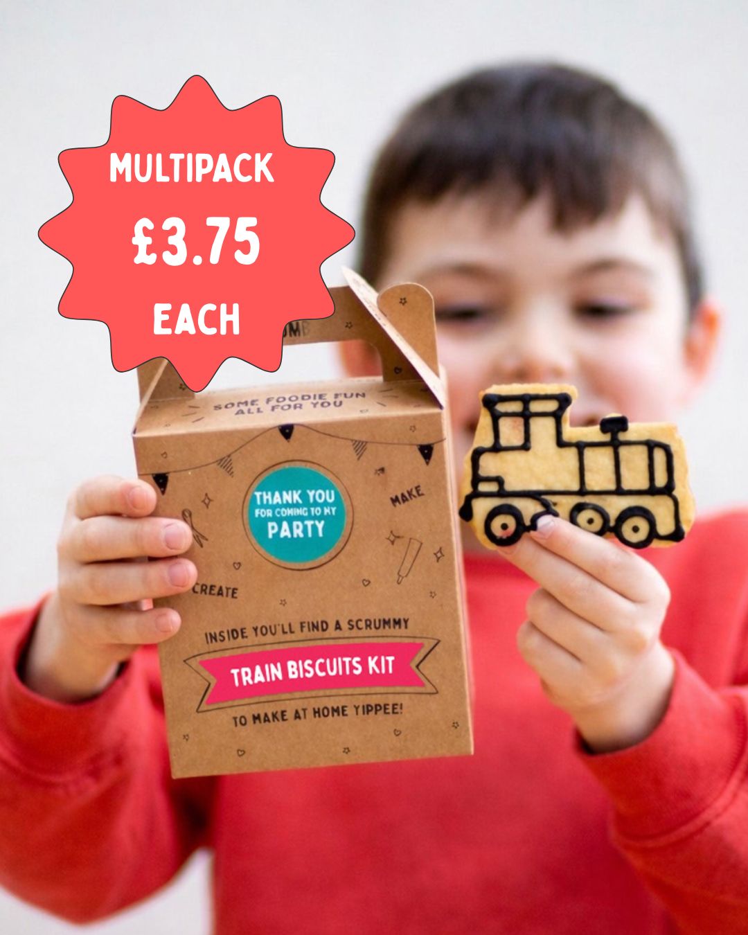 This biscuit kit party bag includes a train-shaped cutter so kids can bake and decorate their own dinosaur biscuits at home after the party.